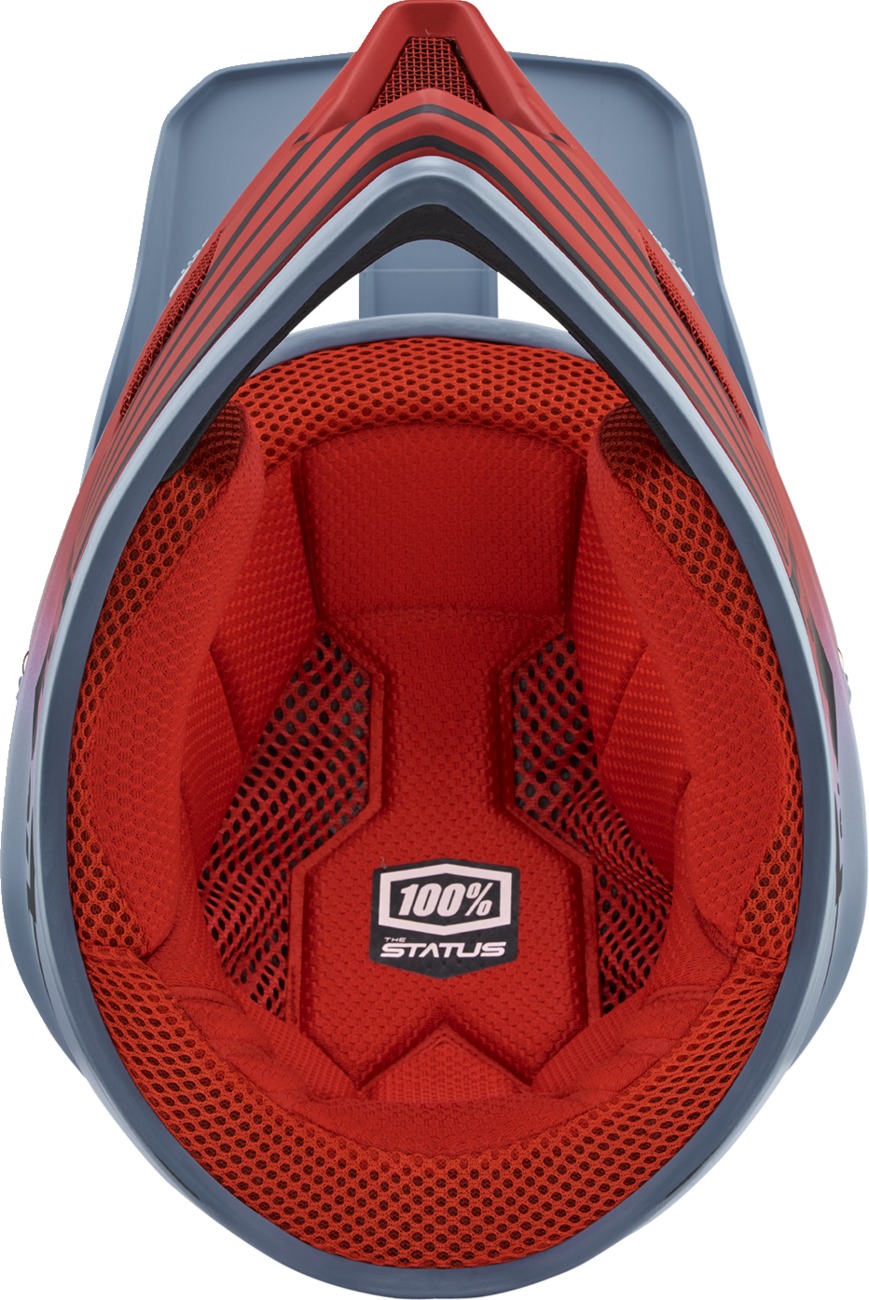 The 100% Status Bicycle Helmet in Red Caltec Gray delivers premium protection and comfort for bicycle riders. Featuring an active cooling system, this helmet maximizes airflow both while in motion and at rest for superior ventilation. The ultra-light composite fiberglass shell ensures durability without added weight. It is compatible with inflatable emergency helmet release systems for enhanced safety. The removable comfort liner, cheek pads, and chin strap covers make cleaning easy. Additional features include a padded polyurethane chin bar interior for improved impact protection and an adjustable visor with lightweight screws. Designed for unisex adult riders seeking a blend of safety, style, and comfort.