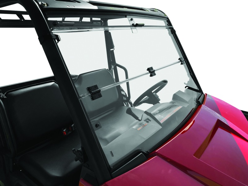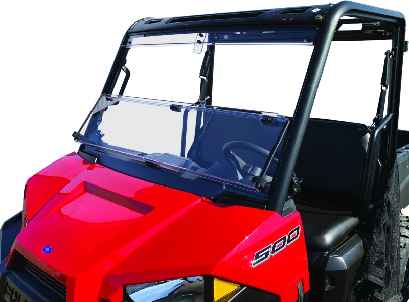 The 17-21 Polaris Ranger 500 Windbreak Folding Windshield is constructed from premium 0.177″ thick, optically clear polycarbonate material. It features a hinged design that allows for easy adjustment to increase or limit airflow in the cabin. The windshield attaches securely to the roll cage with Velcro straps and includes an upper filler panel to eliminate gaps between the cage and windshield. Its toolless design enables quick and easy installation or removal, though partial assembly is required.