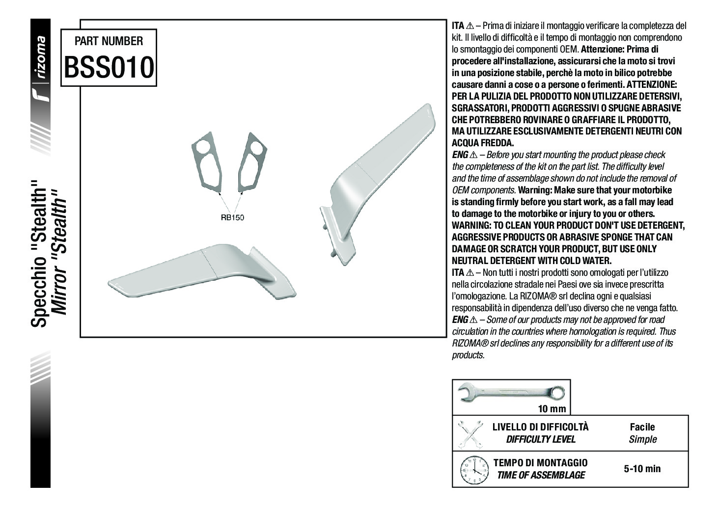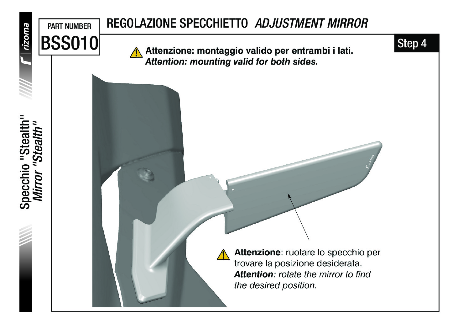 - The mirror consists of a fixed part, which allows the fitting directly to the fairing, and a movable part, which acts as a mirror glass holder