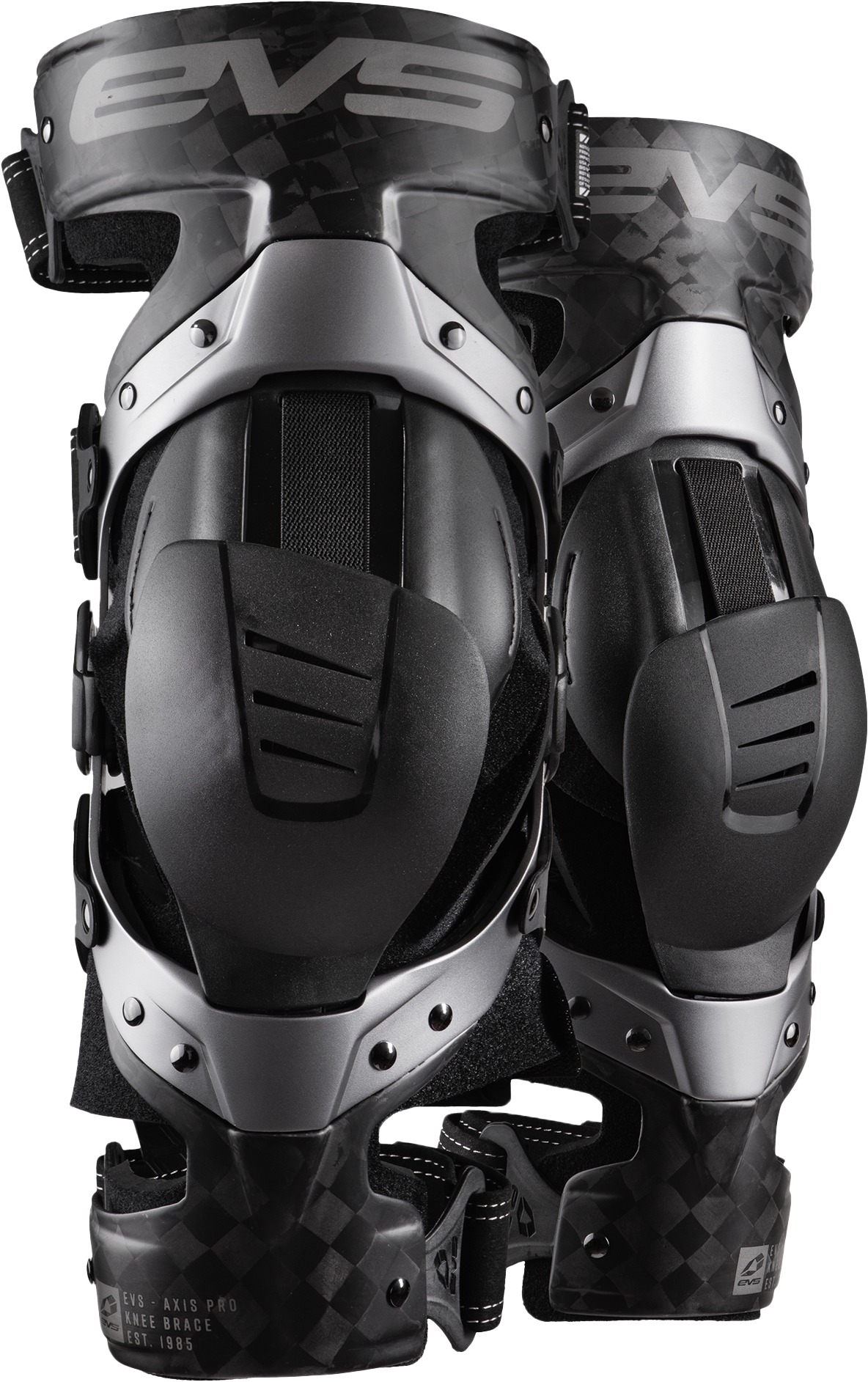 The EVS Axis Pro Knee Brace Pair in Black/Grey (Large) offers advanced protection with a lightweight and rigid aluminum and carbon fiber frame. Designed for serious riders, these braces feature patented Tru-Motion 2.0 anatomically correct hinges for natural movement and enhanced safety. The monocoque aluminum hinge creates a low-profile fit, while carbon fiber upper and lower cuffs ensure durability. Additional features include a Dual Defense full coverage knee cup, adjustable hyperextension lockouts, improved sharkskin neoprene liners, compression comfort cuffs, modular synthetic leather straps, and a thermo fit molded liner for a secure and comfortable fit. Ideal for off-road and motocross use, this brace delivers premium knee protection for demanding conditions.