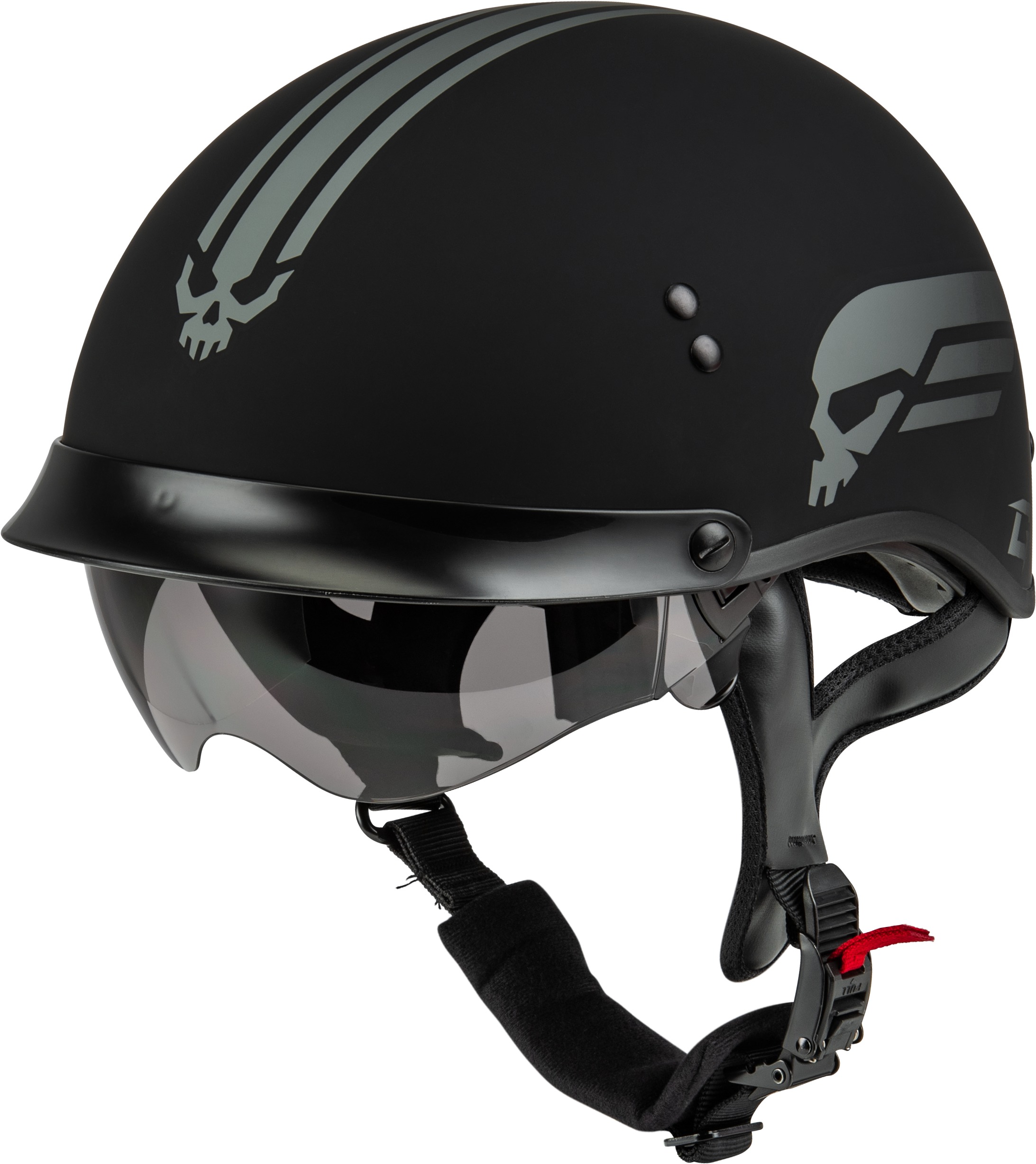 The GMAX HH-65 Retribution Helmet in Matte Black/Silver (2X-Large) offers the perfect blend of modern style and premium features for street riders. This DOT Approved half helmet features a COOLMAX® interior to keep you dry and comfortable, with moisture-wicking and quick-drying properties. The removable interior allows for easy cleaning, while the comfort liner, shell, and EPS are designed for maximum venting to reduce heat build-up. Enjoy superior sun protection with two retractable, hard-coated 100% UV400 resistant sun shields (clear and smoke tint included), both easily removed without tools. A removable, snap-in neck curtain provides warmth during cooler rides and includes pockets for intercom speakers. The dual-density EPS technology delivers a low profile look and fit, and the helmet is intercom compatible, making it an excellent choice for comfort, safety, and convenience.