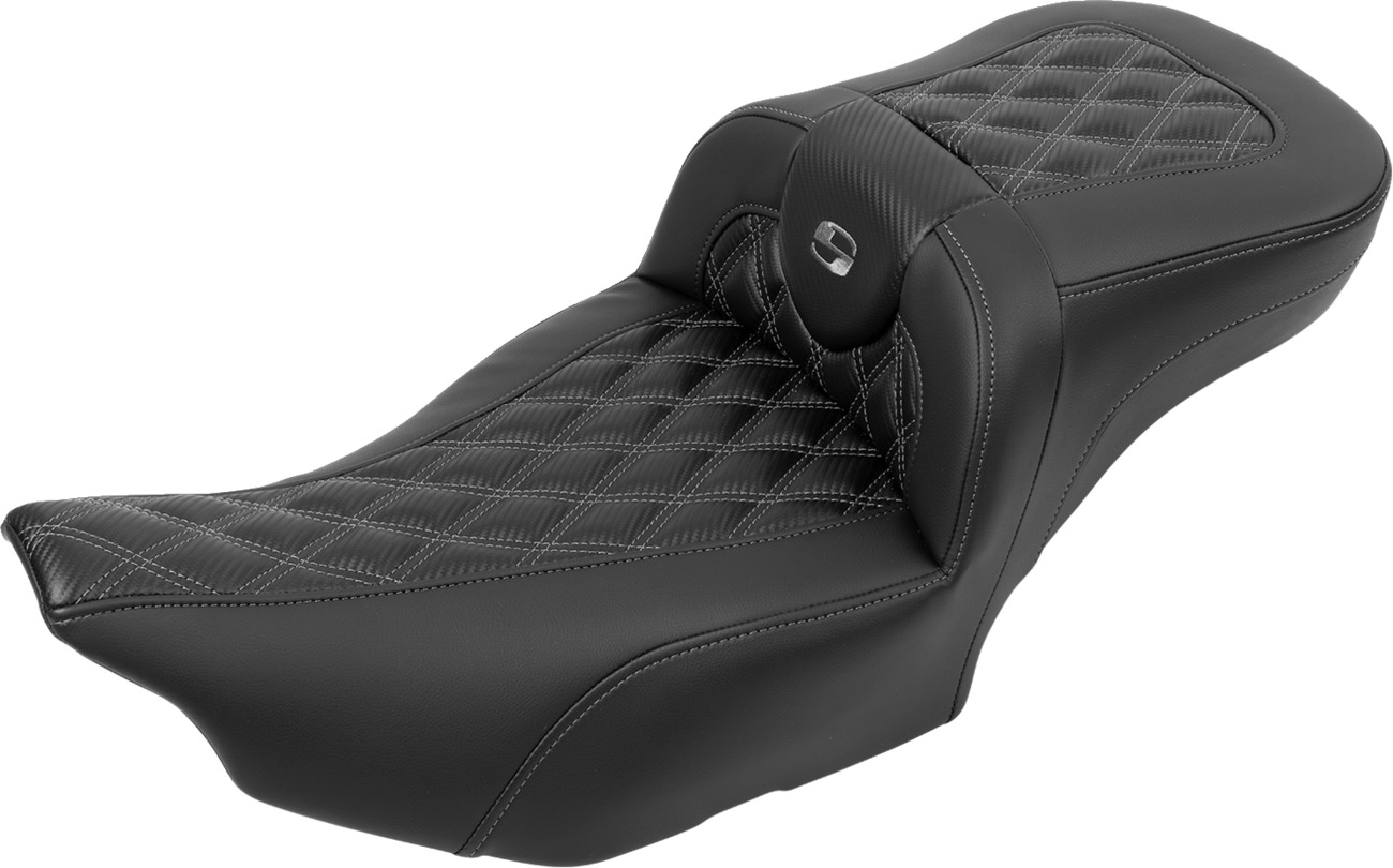 The Saddlemen Roadsofa™ Extended Reach Seat is designed to enhance long-distance riding comfort for both driver and passenger. This one-piece seat moves the driver 1.5" further back from the standard Roadsofa™ seating position, offering improved legroom and support. SaddleGel™ inserts in both the front and rear help reduce tailbone pressure and increase circulation. The tall lumbar support and wide saddle provide superior comfort for the back and legs, while the tapered front allows for easier reach to the ground. Featuring a refined split-cushion design, the seat separates the seating area from the lumbar support to further reduce pressure points. The ventilated, soft leather upholstery with lattice gray stitching offers a luxurious look and feel. Comes with a fitted rain cover to protect against water and dirt. Fits Harley-Davidson FLTRXSTSE CVO Road Glide ST, FLHX Street Glide, FLTRX Road Glide, FLHXSE CVO Street Glide, and FLTRXSE CVO Road Glide models from 2023-2024 (see fitment for details). Made in the USA.