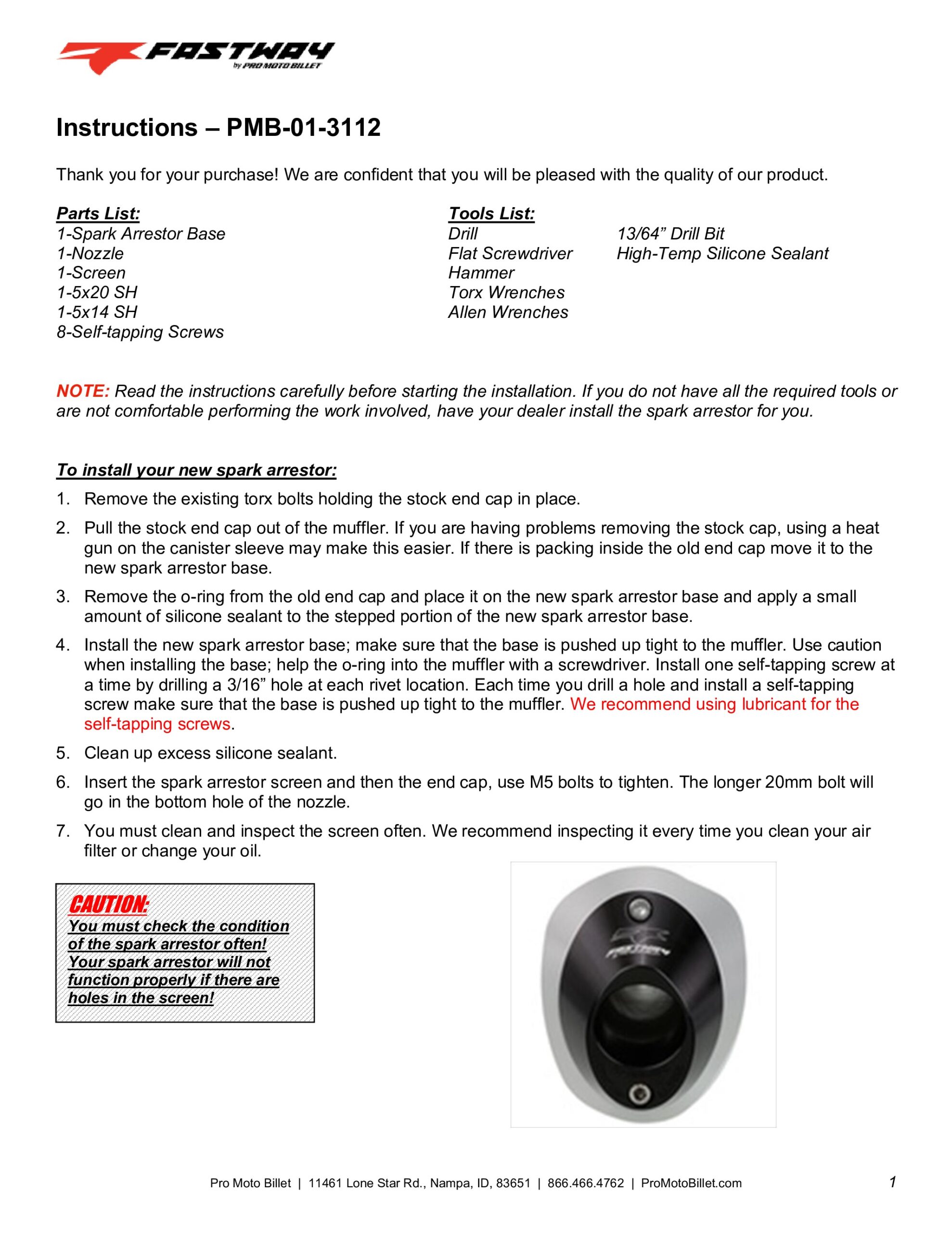 The Fastway Spark Arrestor End Cap is designed as an efficient way to convert your stock muffler into a U.S.F.S. approved spark arrested muffler. When the spark arrestor screens are not required, such as at the MX track, simply remove two machine screws on each end cap and take out the screens. Each end cap is machined out of solid 6061 aluminum and anodized with a protective finish. Designed to quickly and easily convert stock, 4-strokes and some 2-strokes, to United States Forest Service (U.S.F.S.) approved mufflers.
