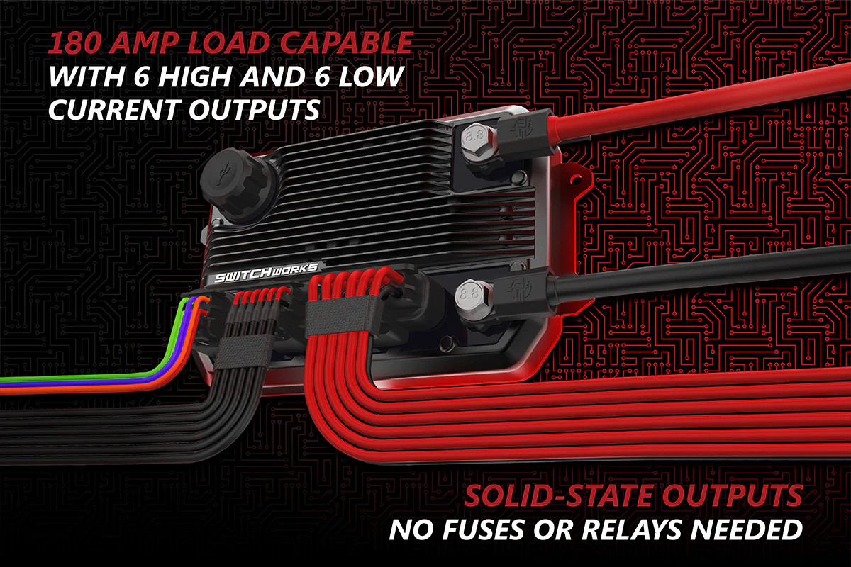 The SSV Works SwitchWorks 12 Output Electronic Switcher offers ultimate control over your UTV or ATV accessories. Featuring 15 fully programmable outputs managed via an LCD Touch-Button display, this unit allows you to customize your vehicle’s controls with 64 pre-loaded icons or upload your own via the PC app. The weatherproof control module supports up to 200 amps, providing reliable solid-state switching, strobe control, and dimmer capabilities. Plug-&-Play installation makes setup easy, while solid-state electronics ensure faster, more reliable operation than traditional relays. Take full command of your accessories with a professional-grade, customizable solution.