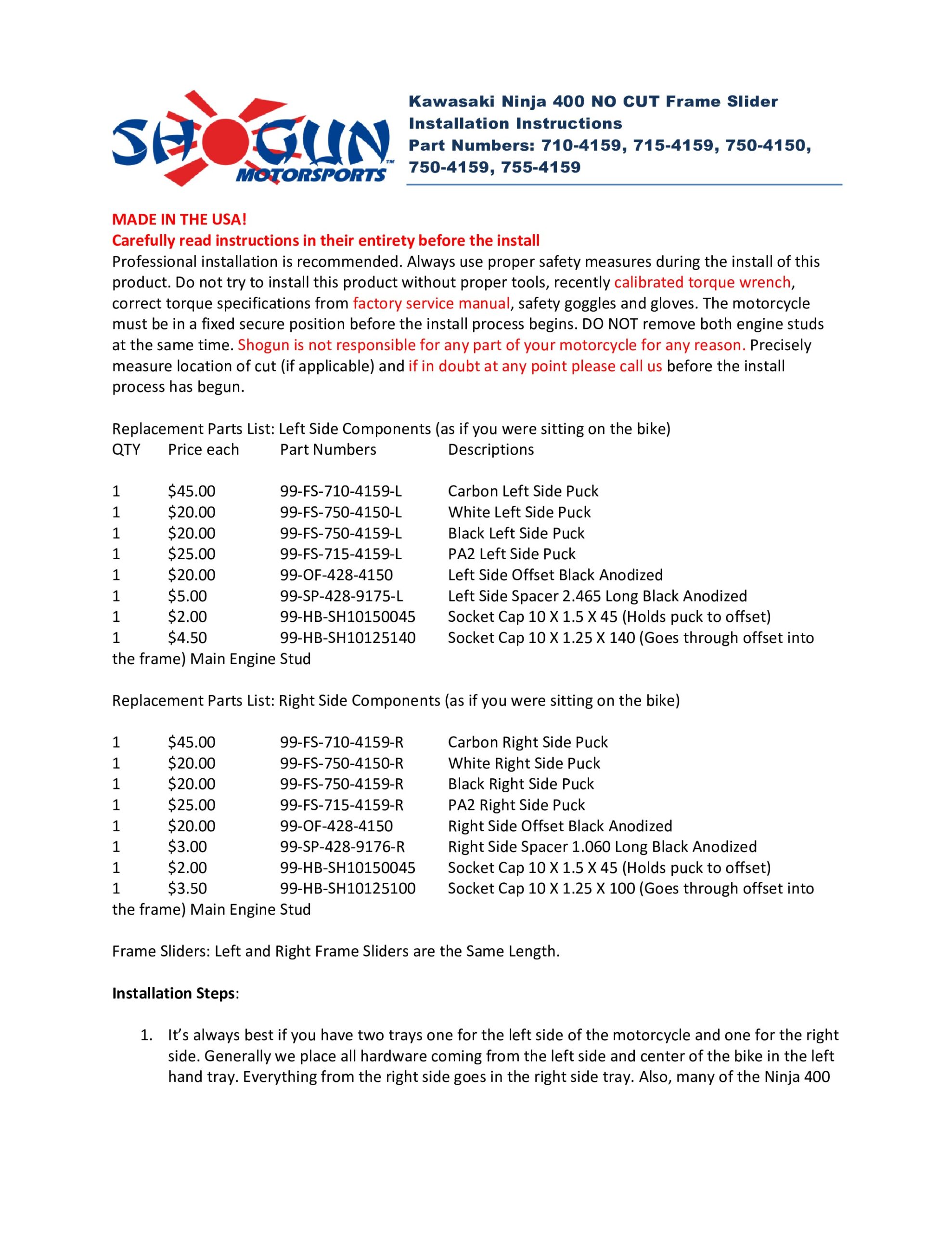Shogun Motorsports, known for quality American made products is offering a one year free replacement parts promotion eligible on white and black frame sliders (including black bar end and swingarm spools when purchased in the full kit-one free slider replacement puck). The first frame slider manufacturer in the industry to do so! Go to www. shogunmotorsportspromo.com for details.