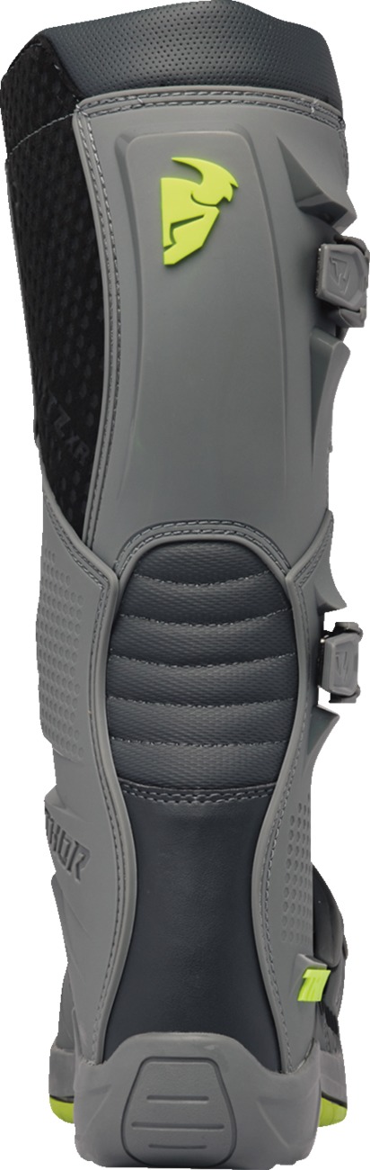 The Thor Blitz XR Boots in Charcoal Gray, size 15, deliver durable off-road protection and comfort for adult riders. Features include a padded mesh interior for improved breathability, injection molded outsole with a steel shank insert, and a fully synthetic calf overlay for durability and grip. The boots offer a custom fit with three fully adjustable straps and a pre-curved injection molded shin plate. Medial abrasion plates with integrated shift protection and positive lock buckles further enhance safety and longevity. Certified to EN 13634:2017 standards for rider protection.