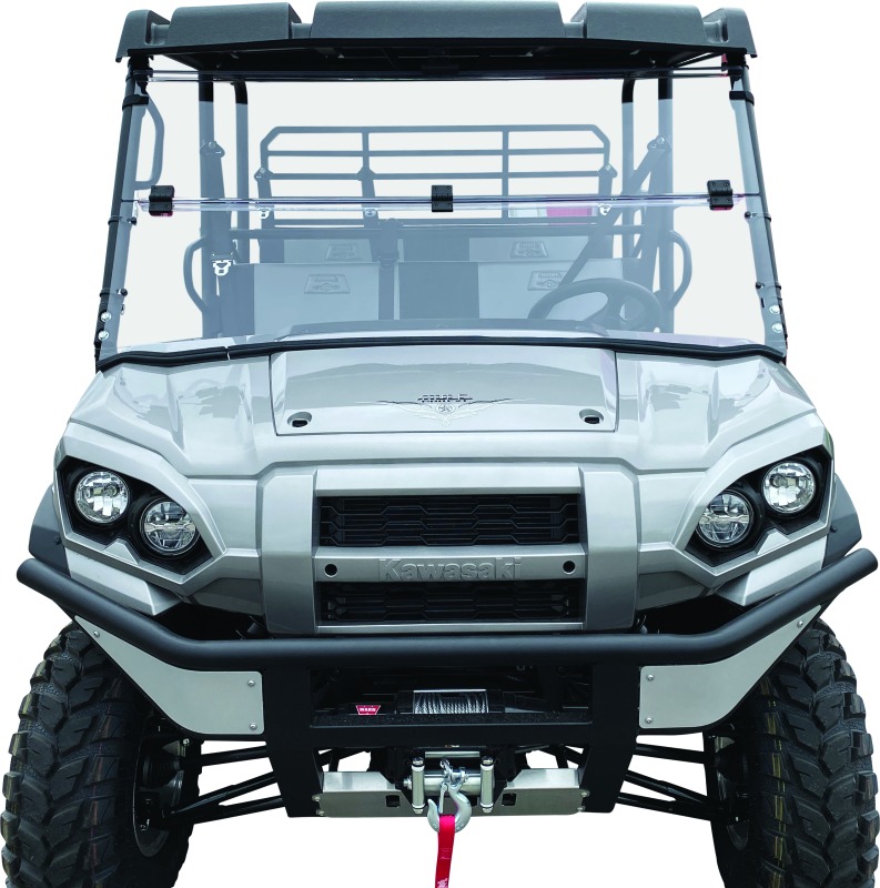 The 16-22 Kawasaki KAF820 Mule Pro-DX Windbreak Folding Windshield is made from 0.177″ thick, optically clear polycarbonate material. It features a folding design that can be hinged up or down to control airflow in the cabin. The windshield attaches to the roll cage using Velcro straps and includes an upper filler panel to eliminate gaps between the cage and windshield. Its toolless design allows for quick and easy installation or removal. Partial assembly is required.