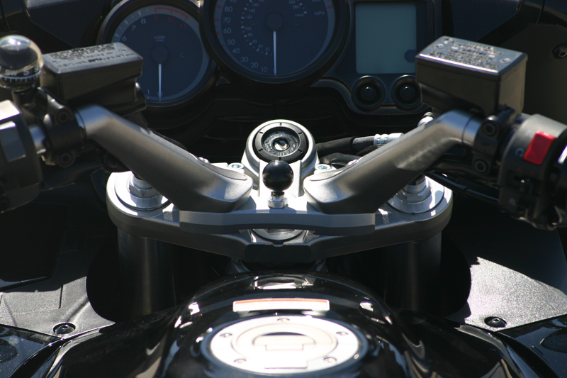 Since introducing the replacement triple clamp for the FJR we have heard from many users that wondered why we went with this design vs. a standard riser under the stock handlebars. The triple clamp afforded the rider a many benefits first there was the benefit of moving the bars closer to the rider (risers alone wouldn’t have accomplished this) second we narrowed the stock triple clamp to gain slack in lines and third we gave it a two pinch bolt design vs. the stock single. While the benefits were substantial we had many that didn’t want to change the triple clamp out due to the cost for installation and the price of the product. Recently, with the introduction of HST bars for other models we have had a clammoring for HST bars for the FJR. We brought the bike in house with the full intention of producing a set of HST (Horizon Sport Touring, multi adjustable bars.) However, upon close inspection and some design work we determined the cost to the end user would be too great. It would have required all new lines, wiring and the controls would have needed to be altered. So we came up with the next best thing. The HeliBars Tour Performance Handlebar Bridge.