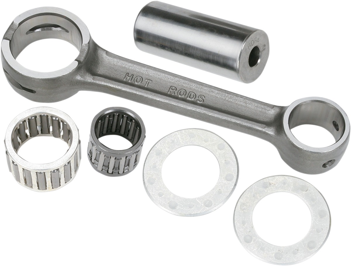 The Hot Rod Kit LT80/KSF80 offers heavy-duty OE replacement connecting rods crafted from certified 8620 AISI steel for superior strength. These rods feature high-tech crank and wrist bearings, including a silver-coated crank pin bearing for improved sliding and reduced temperatures. The crankpins are made from hot-rolled ASTM 4115 and case-hardened to a level of 58-62Rc, ensuring durability and longevity at high RPMs. The kit includes connecting rod, crank pin, crank bearing, wrist pin bearing, and phosphor bronze thrust washers. The big end of the rod is uniquely designed with side scalloping and vent slots to minimize bearing race distortion at high RPMs. The small ends are double-drilled to enhance lubrication and cooling of the wrist pin bearing. The connecting rods are shot-peened to eliminate surface stress risers and are double-honed for an ultra-round bearing surface for high-RPM reliability. Additionally, the rods are copper-coated to protect against brittleness during the case-hardening process, and they are compatible with both Hot Rods and OE crankshafts. This kit provides an affordable, premium-quality replacement solution for high-performance applications.