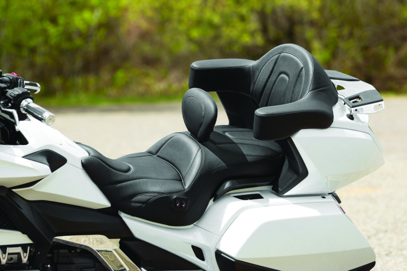 Mustang’s Standard Touring positions the rider at a similar height and reach to the controls compared to stock, but its contoured, deep bucket design gives the rider a feeling of sitting further “into” the motorcycle for improved overall comfort and control. The luxurious hand-sewn vinyl cover features a detailed stitch pattern that flows with the Gold Wing’s lines, while contrasting mesh “gripper” inlays complement the grilled cowling accents. Comes fully equipped with heating element and a built-in receiver for the included matching adjustable driver backrest for maximum support. The matching Passenger Backrest (P/N 79921 (18-20) & 79960 (21-25), sold separately) contains a separate heating element and controls, a backrest that angles the upper back slightly forward for better posture, and extended armrests for unbeatable comfort.
