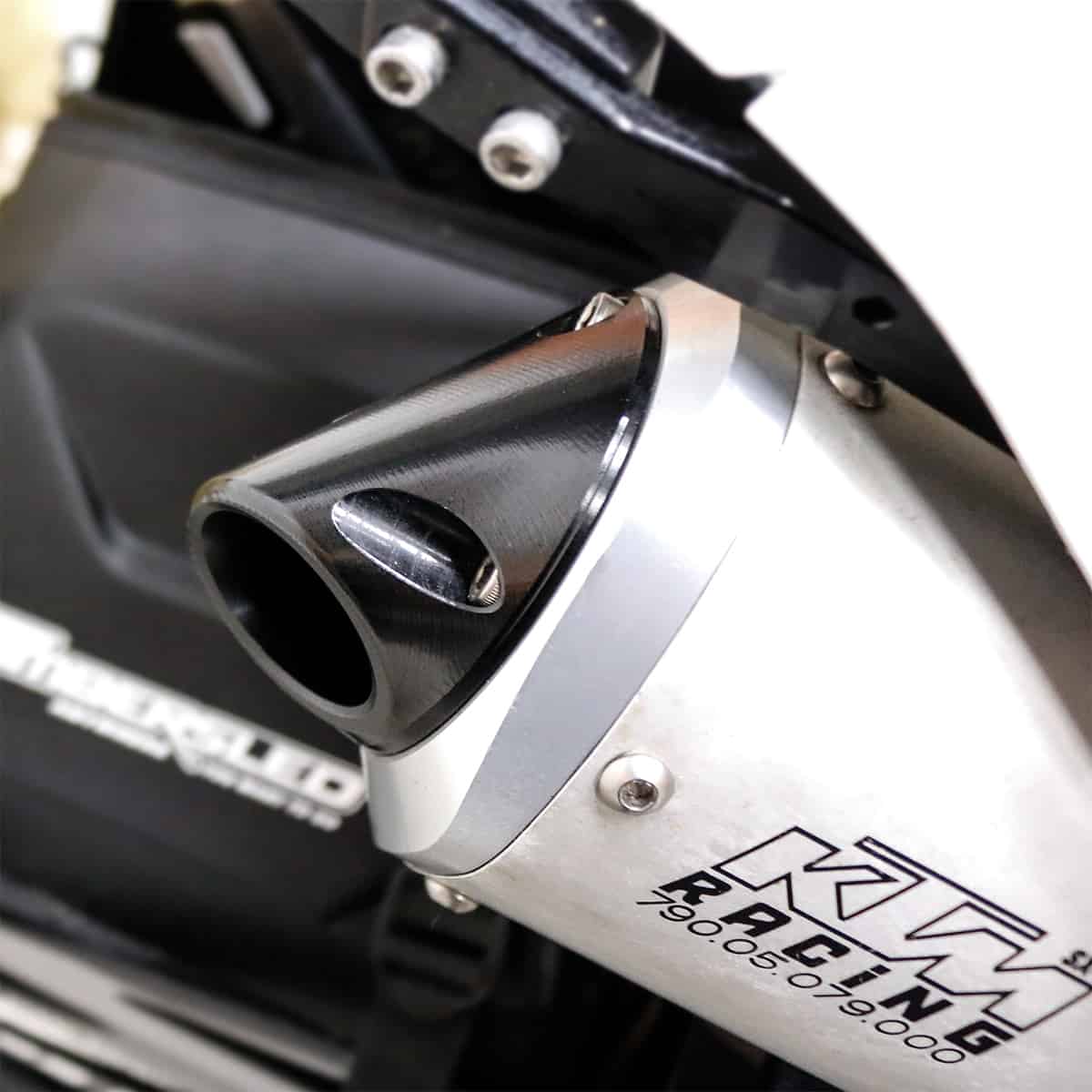 Lynn Hodges, founder and president of Pro Moto Billet is an avid Snow Bike enthusiast. At the beginning of the season, he spent a great day on the trail with his new KTM 450 equipped with a Timbersled Riot, but realized his auxiliary fuel tank had literally been scorched and melted from the KTM’s exhaust heat. Had the auxiliary tank been completely melted through, at minimum this would have resulted in fuel spilling, but worse it could have ended in a fire. The Fastway Side-Shooter Exhaust Nozzle now becomes another Fastway solution to make life better and safer on the snow.